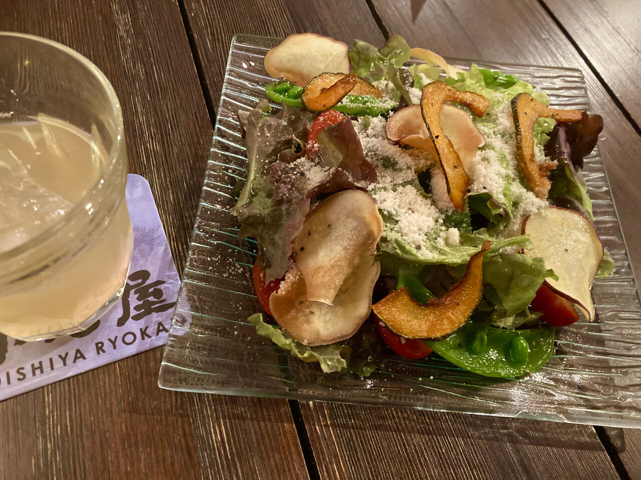 長野名物りんごジュース、地元でとれた野菜のサラダ、